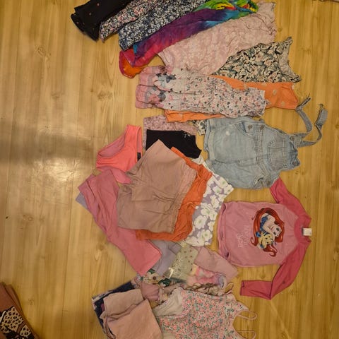 Her er det 6 singletter, 6 tights 2 tyllskjørt, 3 kjoler, 1 pysj, 1 tskjorte, 1 pysjbukse, 1 sett med tights og genser. Noen få flekker på få av klærne ellers er alt pent og helt. Ikke prøvd å fjerne flekkene men regner med at de går av med påstell såpe. 🤩