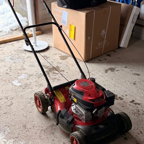 Bensindrevet gressklipper i rød og svart farge. Klipperen har fire hjul og håndtak med betjeningsbøyler. Motoren er plassert foran på dekselet, og det er justerbart håndtak. Egnet for klipping av plen i hage og uteområder. Nærmere tekniske spesifikasjoner som klippebredde, effekt og modellbetegnelse er ikke oppgitt.