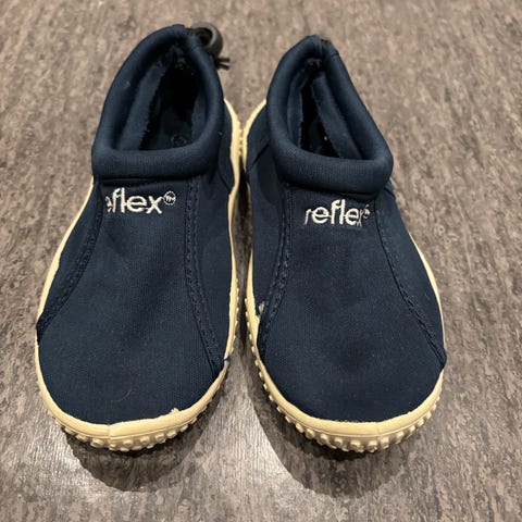 Reflex badesko for barn, unisex modell i størrelse 24. Skoene er gule med hvit såle og har justerbar stramming øverst for bedre passform. Undersålen har mønster for bedre grep på våte underlag. Egner seg til bruk ved strand, basseng og andre aktiviteter i vann og ved vannkant.