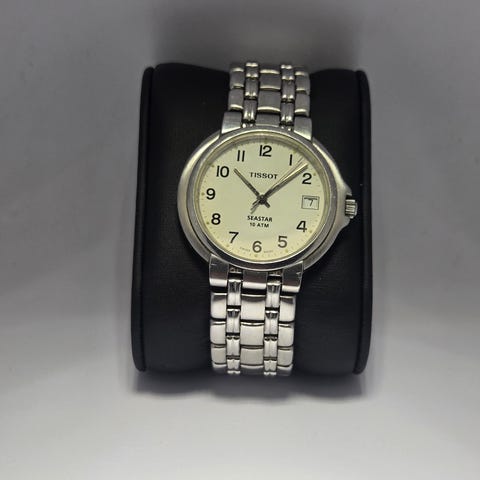 Den leveres med sort lærreim med lys kontrastsøm og klassisk spenne. Passer som hverdags- og penklokke til herre.