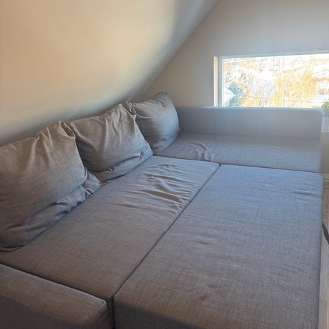 Selger en stilren og komfortabel sjeselong fra IKEA i lys grått stoff. Den har et moderne og tidløst design som passer fint inn i de fleste hjem.