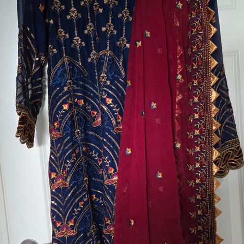 Plagget har dekorative broderier og perledetaljer, samt gjennomsiktige lag i stoffet. Bukse og duparta er med