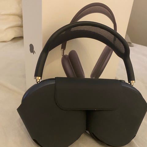 Apple AirPods Max hodetelefoner i sløv. Over-ear hodetelefoner med polstrede øreklokker og bøyle med mesh-stoff for komfort ved lengre bruk. Trådløs tilkobling via Bluetooth til kompatible enheter fra Apple og andre produsenter. Egnet for lytting til musikk, film og tale på farten, hjemme eller på kontoret.