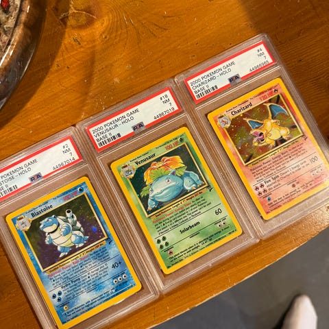 Pokémon Celebrations Classic Collection samlekort med motivene Venusaur, Blastoise og Charizard. Kortene er holografiske og innkapslet i PSA-holdere med graderingsinformasjon synlig på etiketten. Baksiden viser standard Pokémon-kortdesign. Egnet som samleobjekt for Pokémon-kortsamlere som ønsker graderte eksemplarer fra Celebrations-serien.