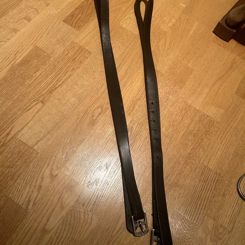 Pent brukte og i god stand. Prestige stigbøyleremmer i svart kalveskinn, lengde 160 cm.