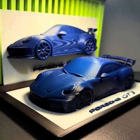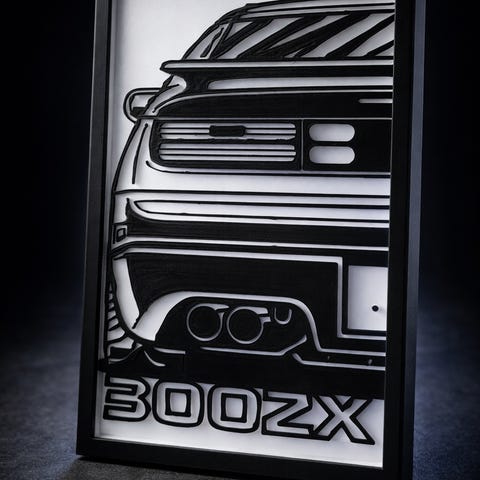 Porsche GT3 RS veggdekor med stilisert konturtegning av bilmodell og rød GT3 RS-tekst. Rektangulært motiv i ramme, egnet som veggpynt i for eksempel stue, kontor, garasje eller hobbyrom. Designet viser bilen fra siden med markerte detaljer og stor hekkvinge.