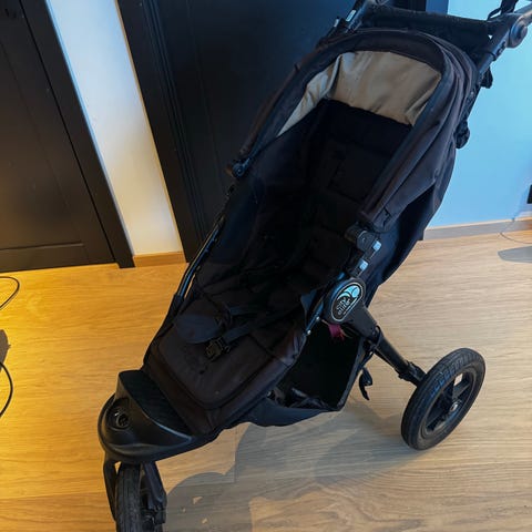 Baby Jogger sportsvogn med tre hjul i svart farge, men fargen er solbleket. Vognen har justerbart sete med fempunktssele, stor kalesje og fotbrett foran. Forhjulet er svingbart og kan låses, og de to store bakhjulene gir stabilitet. Håndtaket er ergonomisk utformet, og det er oppbevaringskurv under setet. Egnet som sports- og trillevogn til ett barn.