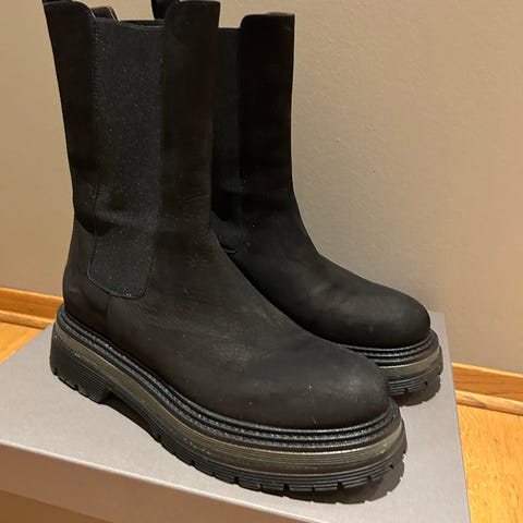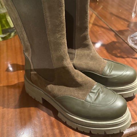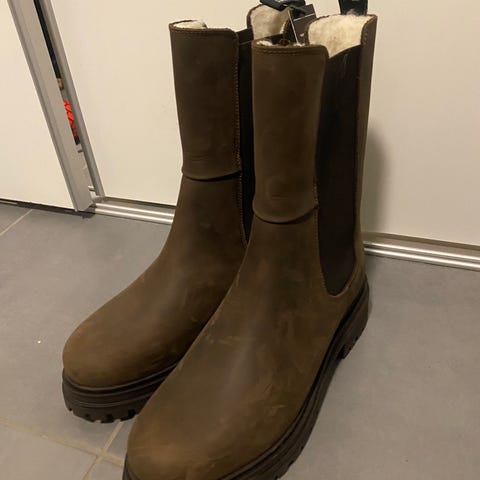 Stockholm Design Group støvler i størrelse 40. Støvlene har brun overdel med svart kontrastparti og kraftig, profilert såle. Modellen har glidelås på innsiden og elastisk felt på utsiden for enklere av- og påtaking. Egnet som hverdagsstøvler i kjøligere vær.