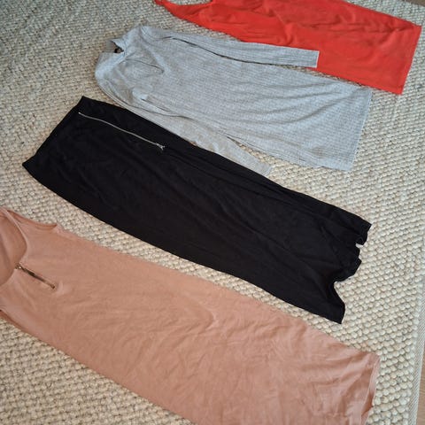 7 topper, 4 bukser, 1 shorts og 2 kjoler.
