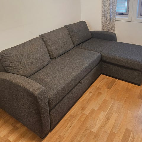Brettes ut som sovesofa. Noen bruksemerker (se bilde), ellers veldig fint brukt. Må hetes i heggedal! Veldig lik varmark modellen på jysk nå.