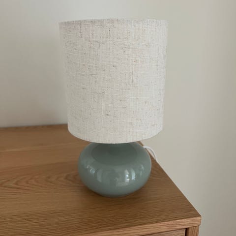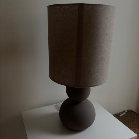 Fin bordlampe brun fot og beige skjerm, høyde 48 cm dia skjerm er 24cm.