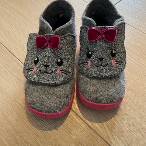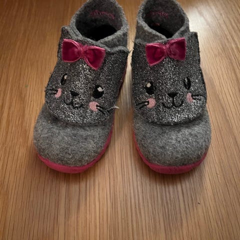 Superfit tøfler for barn i størrelse 20 for jente. Tøflene er i grå ullfilt med rosa såle og detaljer. Overdelen har kattemotiv med broderte ansiktstrekk og påsydde rosa sløyfer. Yttersålen er i rosa gummi med mønster for bedre grep. Innvendig er tøflene myke og varme, egnet som innesko eller tøfler hjemme eller i barnehage.