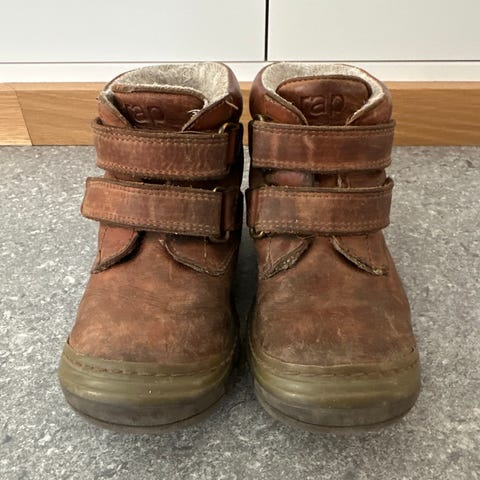 Kavat vinterstøvler i brunt skinn i størrelse 26. Foret inni, med borrelåsstropper over vristen for enkel justering og av- og påtaking. Yttersålen er i gummi med grovt mønster for godt feste. Passer som hverdagssko i kjøligere vær.