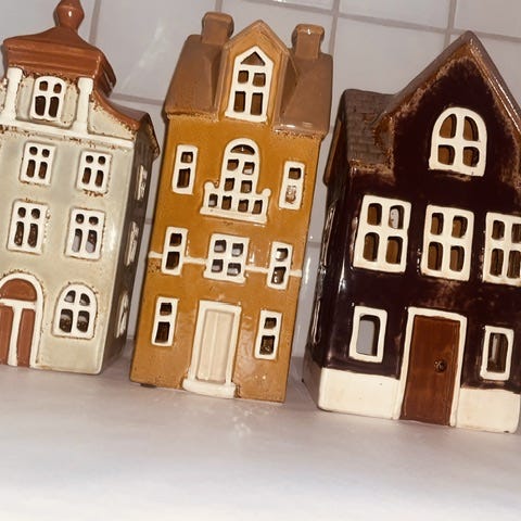 Flott ubrukt små koselige pyntehus i rekke,med fine duse farger selges.