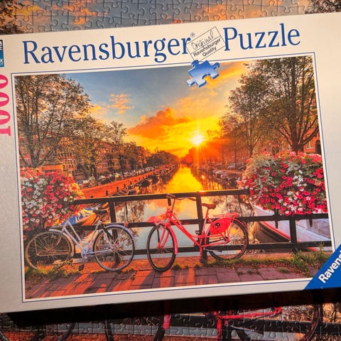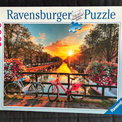 Ravensburger puslespill med motiv av solnedgang ved en kanal med sykler og blomster på en bro. Puslespillet består av 1008 brikker, er komplett og ferdig størrelse er ca. 70 x 50 cm. Hentes I Molde. Kan evnt sendes med HeltHjem
