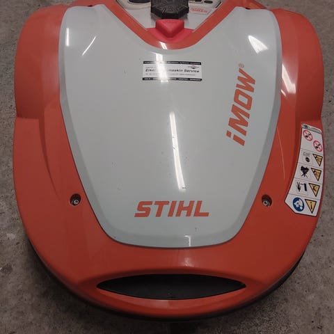 Stihl iMow robotklipper i oransje og hvit farge. Modellen har innebygd display og betjeningspanel på toppen, samt nødstoppsknapp. Robotklipperen er beregnet for automatisk klipping av plen innenfor et avgrenset område med kanttråd. Egnet til bruk i hage for jevn og regelmessig gressklipping uten manuell betjening.