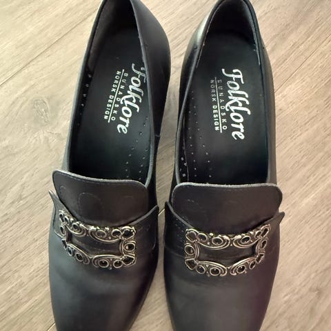 Lite brukte brukte bunadsko med noen bruktmarked. Tror de er av ekte skinn.