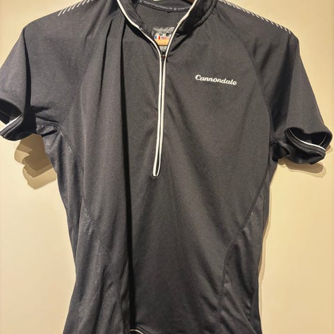 H&M sykkeltrøye med kort erm i svart farge. Trøyen er laget i pustende DryMove-materiale som transporterer fukt bort fra kroppen. Den har hel glidelås foran og tre åpne lommer bak for oppbevaring av småting under sykling. Passform og snitt er tilpasset dame. Egnet til landevei- og hverdagssykling i mildt til varmt vær.