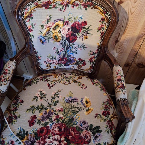 Den er veldig fin. 🌸 Pen stol med håndbrodert trekk. Rokkokkostil.