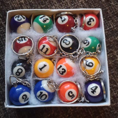 Disse er gamle og har gulnet litt med tiden. Sjarmerende i mine øyne, men biljardbord er solgt , så hva skal jeg med kuler???
