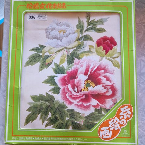 Ny-vintage BRODERIPAKKE med nål, stramei, mønster og garn. Strameien er 100% bomull og broderigarnet 100% ull.