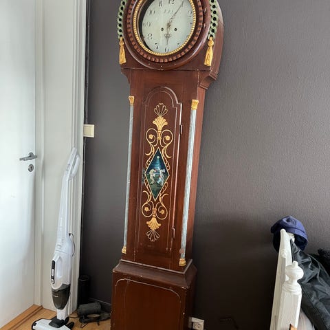 Selger 2 stk. gulvur i tre med utskårne dekorative detaljer på topp og sokkel. Urskive med romertall og metallfargede elementer. Kabinettet har glassdør i front med synlig pendel og mørke metallhengsler. Passer som frittstående gulvur i stue, gang eller andre oppholdsrom der man ønsker et tradisjonelt mekanisk ur som innredningselement. 1 urverk virker, det andre ikke.
