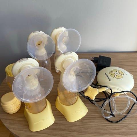 Medela Swing Maxi elektrisk dobbel brystpumpe med tilbehør. Settet inkluderer hovedenhet, to brysttrakter med flasker, strømledning og diverse smådeler. Det følger også med original eske, brukerveiledninger og informasjonshefter.