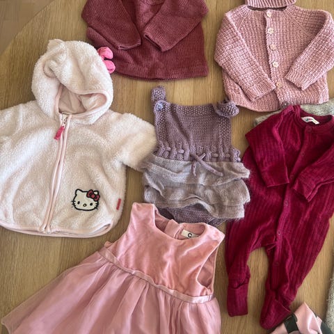 Klespakke størrelse 62. Joggesett, romper, kjole og heldress/bamsedress. Alt i størrelse 62, unntatt romperen som ikke har størrelseslapp, men den ser ut til å være 62 eller litt større.