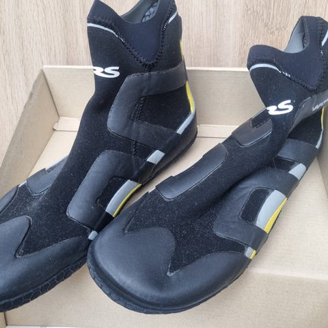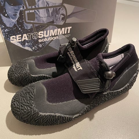 Nye og ubrukte i original eske. Sea to Summit Bomber neoprenesko i størrelse XL. Skoene er laget i neopren med forsterket og mønstret gummisåle for godt grep. Justerbar stropp over vristen og stramming bak hælen for bedre passform. Farge hovedsakelig svart med mørke grå detaljer. Egnet som badesko eller til vannsport og andre aktiviteter i og ved vann der man ønsker beskyttelse og bedre fotfeste.