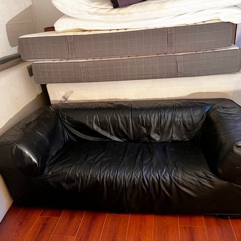 Skinnsofa i svart uten større skader. Sjeselongen er den mest slitte delen, men likevel god å sitte i. Har noen bruksmerker. Selges fortløpende, kjøper må hente.
