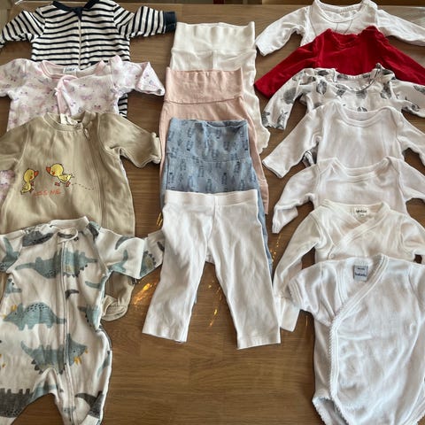 To dresser i ullblanding (Réflex), to sellebukser, en bukse, 10 bodyer (5 omslagsbodyer), 4 tights, en lue og en ullbukse