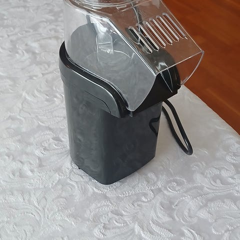 Popcornmaskin i rød farge. Elektrisk maskin for popping av popcorn. Har enkel av/på-bryter på fronten og lokk på toppen for å lede popcornet ned i bolle. Kompakt størrelse som gjør den enkel å plassere på kjøkkenbenken og lagre i skap når den ikke er i bruk. Egnet til tilberedning av popcorn uten bruk av olje, avhengig av ønsket tilberedningsmåte og produsentens bruksanvisning.