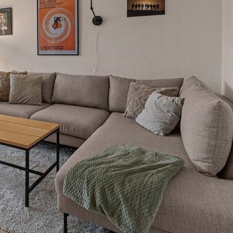 Fin, lys beige, 2 år gammel hjørnesofa selges pga flytting. D-89cm, L 3m x 2,37m