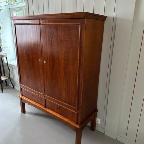 Skjenk/lintøyskap i teak og flammebjørk selges.