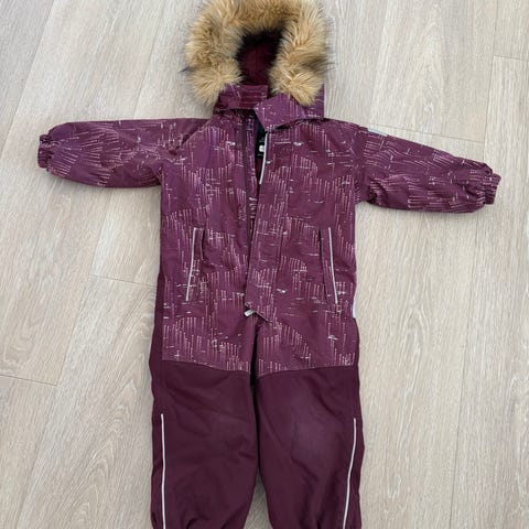 Vinterdress fra Reima i str.116. Fargen er burgunderrød. Dyrefritt og røykfritt hjem. Kun vasket med egnet vaskemiddel. Hetten kan tapes av og på. Nypris 1599kr