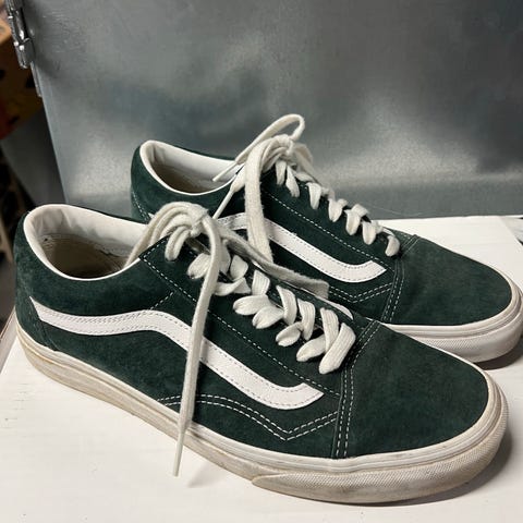Vans Old Skool sneakers i størrelse 37. Skoene har grønn overdel i semsket skinn med hvite detaljer og hvite lisser. Klassisk lav modell med gummisåle. Passer til hverdagsbruk og fritid.