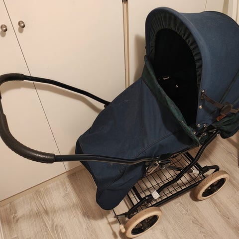 Vogn som har blitt brukt til sovevogn i barnehage i 3 år. Stått i soveskur og kun blitt trilla ute ved få anledningar. Har alltid blitt brukt sovepose eller ullskinn.