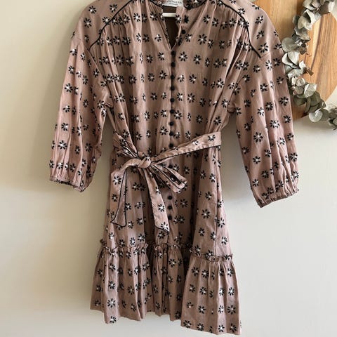 ba&sh sommerkjole for dame i størrelse S. Kjolen er beige med mørkt mønster og har et lett, vevd stoff i lyocell. Den har lange ermer med strikk nederst og rysjedetaljer ved halsen. Passer til bruk på varme dager, til hverdags eller mer uformelle anledninger.