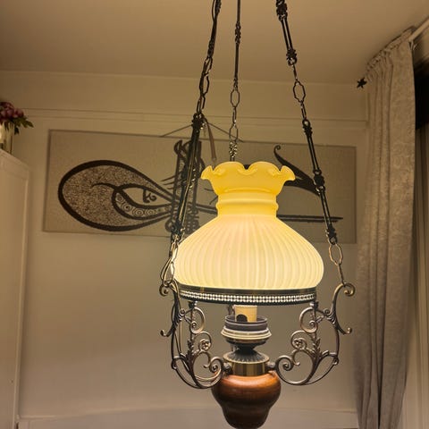 Mørk tre, stoff skjerm og glassinnsats. Sort smijern oppheng.