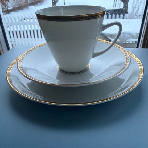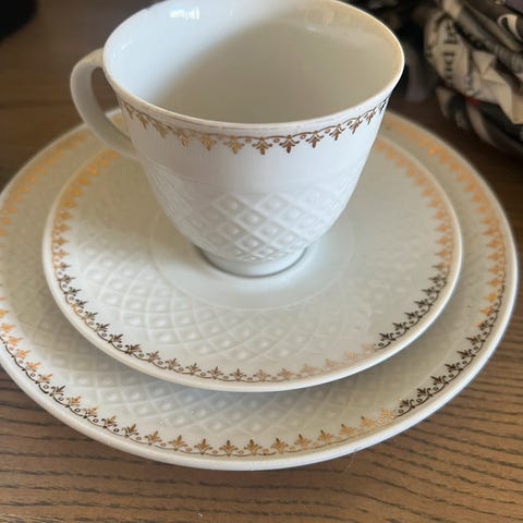 Arabia servise bestående av kopp, skål og tallerken i porselen. Delene har blå bunnfarge med flerfarget blomsterdekor og gullkant langs kanten. Egnet som kaffekopp/tekopp med tilhørende asjett og tallerken til servering av varme drikker, kaker eller dessert. Passer til bruk i kjøkken og spisestue, samt som del av et større Arabia-servise. Selger samlet 12stk.