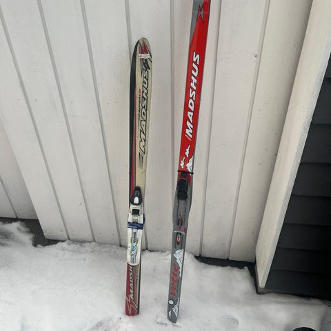 Begge skiene er mønsterski (fiskebein) og trenger ikke smøring – perfekt for barn, skolebruk og hytta.