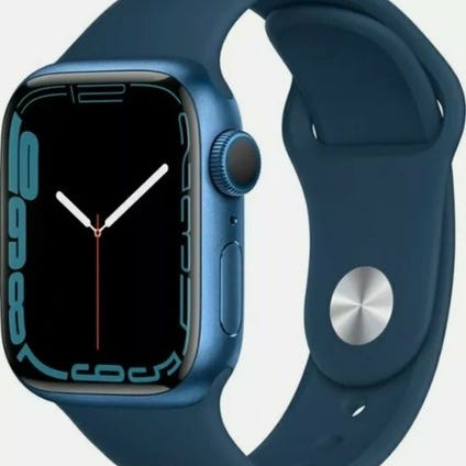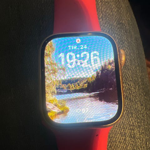 Jeg selger min Apple Watch Series 7 GPS + Cellular i 45 mm med sort gummireim. Klokken er i god stand med noe bruksmerker som kan ses på bilde.
