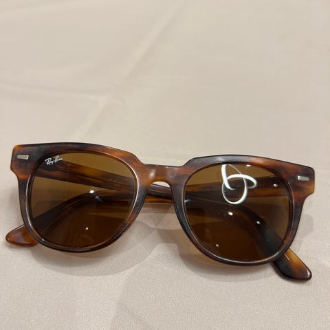 Ray-Ban solbriller unisex i rund fasong. Innfatningen er i brunskjell-mønstret plast med gullfargede metalldetaljer. Mørke glass med Ray-Ban-logo på høyre glass og i venstre glass(lite synlig). Passer for unisex-bruk. Egnet som hverdags- og fritidsbrille i sollys. Inkluderer noen småriper, lite synlig. Selges som de er vist på bildene. Kjøper betaler frakt.