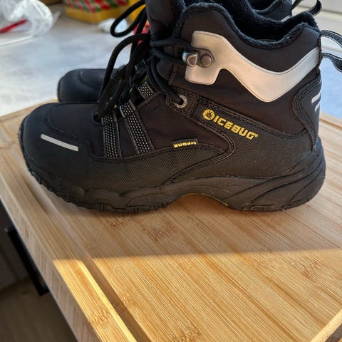 Icebug Jokk 2 M Bugrip vintersko i størrelse 42. Skoene er svarte og har overdel i tekstil og syntetisk materiale. Modellen har høy ankel med snøring for god tilpasning. Sålen er utstyrt med Bugrip-pigger for bedre feste på glatt underlag. Egnet som vintersko til hverdagsbruk og tur på variert føre.