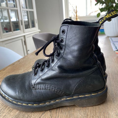 Dr. Martens lakk støvler i størrelse 40. De er litt små i størrelsen. Jeg bruker vanligvis størrelse 39-40, men disse er akkurat så trang at de blir ubehagelig å gå med. Lissene er ikke helt like på begge skoene da de har blitt byttet ut før, på den ene skoen er lissene også veldig slitt. Det trengs nok derfor nye skolisser. Mangler også innersåle. Ellers fint brukt med litt bruksmerker. Er mye bruk igjen i skoen dersom en skaffer nye lisser og innersåle.