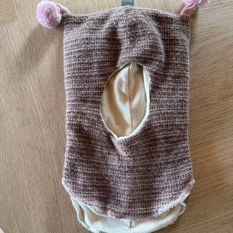 Kivat balaclava i ull i størrelse 1. Balaclavaen er rosa/beige med to dusker på toppen. Ytterstoffet er i ull, og innsiden har mykt fôr for økt komfort. Åpning foran for ansiktet og god lengde nedover hals og nakke for å dekke godt. Passer til bruk på kjølige dager for barn. Litt merke i foret ved halsen. Går nok bort i vask, ikke synlig ved bruk. Røyk- dyrefritt