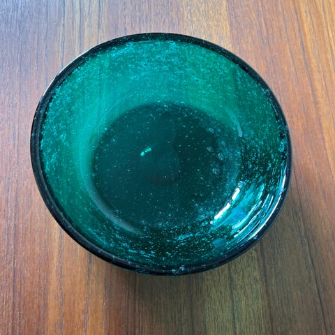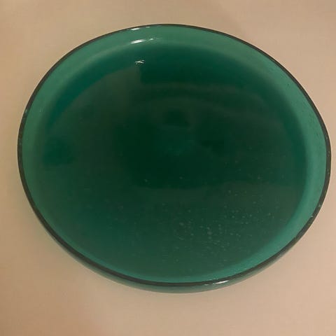 Hadeland Glassverk glassfat i grønt glass. Rundt fat med dekorativ struktur og bobler i glasset. Fatet har lav kant, som vist på bildene, og egner seg til servering eller som dekorasjonsfat på bord eller benk. Signert «Hadeland» i glasset på undersiden.