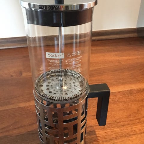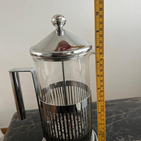 Merk at håndtaket/stativet er tatt av, og følger ikke med (ble kastet for lenge siden), så det kan være nødvendig å bruke gryteklut når du skal helle oppi kaffekoppen.