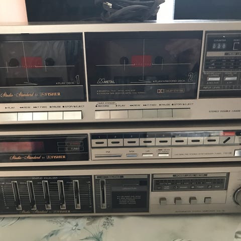 Fisher kassettspiller, Fisher cassette deck, CR-W35T, CR-W873, dobbel kassettdeck, vintage stereo, retro HiFi, kassettopptaker, tape deck, Dolby B C, Studio Standard, japansk hifi, RCA line in, kassettspiller sett, stereoanlegg komponent, retro lyd, analog audio, samlerobjekt, hi-fi stack, sequential play, synchro dubbing