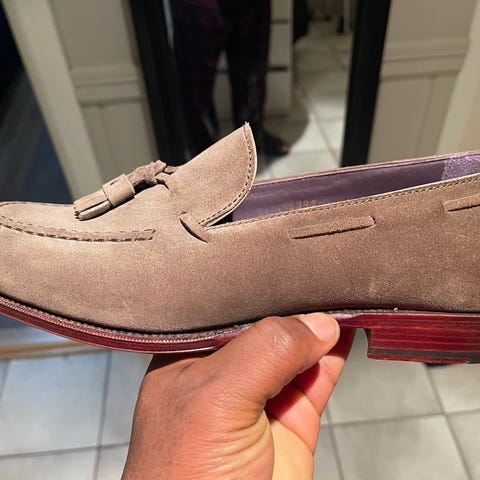 PER LA MODA italienske mokkasiner og båtsko i semsket skinn i grå farge, størrelse 44. Skoene har dekorative dusker foran og flettet skinnsnøring langs siden. Overdelen er i semsket skinn med synlige sømmer, og sålen er i glatt materiale med lav hæl. Modellen er åpen ved ankelen og egner seg som lette sko til hverdagsbruk i milde sesonger. Passform og innersåle er tilpasset herre i størrelse 44.